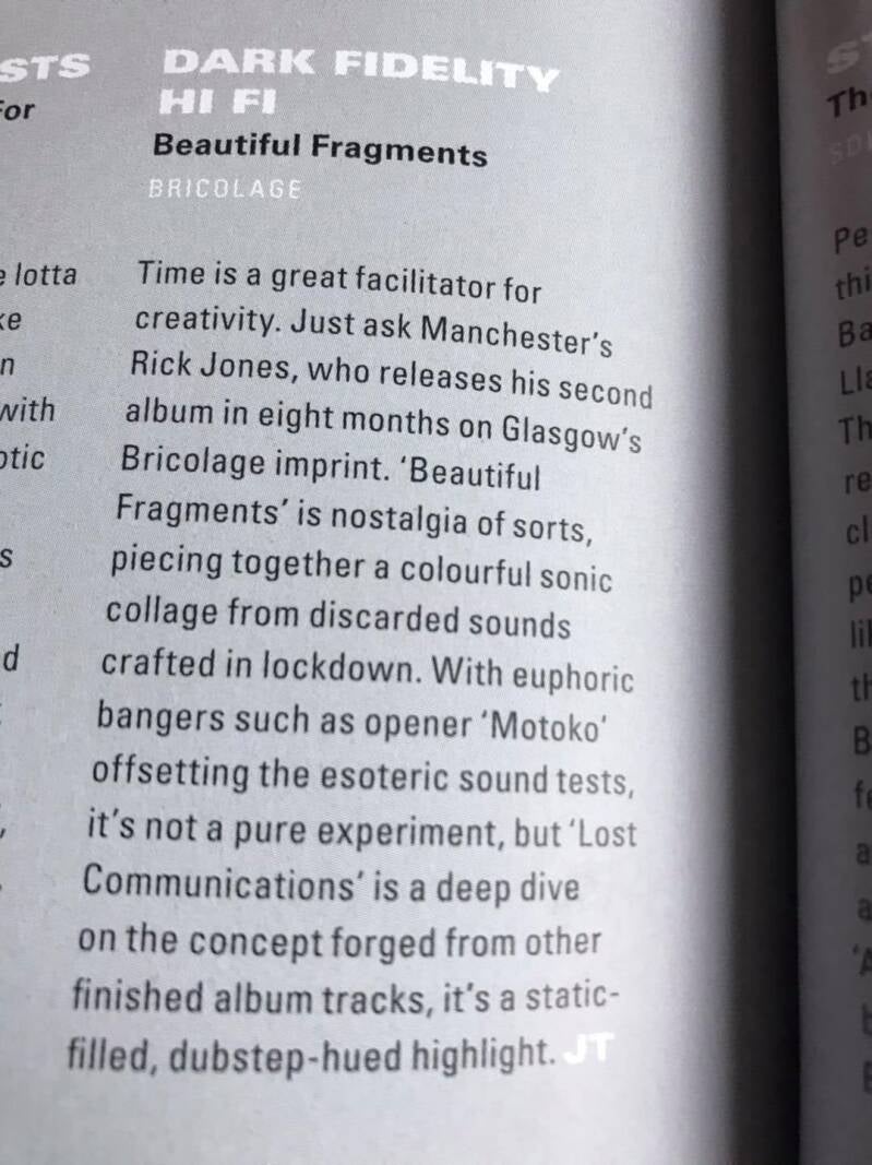 DARK FIDELITY HIFI AKA [ RICK JONES] IS A UNDERGROUND ELECTRONIC MUSIC PRODUCER FROM MANCHESTER[ UK ] MIXING ALL FORMATS OF SOUND ,TECHNO TO DUB, BREAKS TO NEW JAZZ .SINCE 2018 DFHF HAS RELEASED FIVE STUDIO ALBUMS AND TOURS BOTH THE UK AND EUROPE..ALSO WORKING AS A POST PRODUCTION SOUND ENGINEER DFHF HAS WORKED WITH LABELS SUCH AS CUE DOT,NINJA TUNE ,WAXING CRESCENT ,SONY MUSIC, BRICOLAGE AND MANY MORE. RECENT LIVE SHOWS HAVE SEEN DFHF MOVE TOWARDS USING A/V GLITCH VIDEO ART PROJECTIONS , MAKING THE DFHF LIVE SHOW A GIG NOT TO MISS ,TOUR DATES WITH MARCONI UNION , WARRINGTON/RUNCORN NEW TOWN DEVELOPMENT PLAN AND JAMES HOLROYD HAVE MOVED DFHF TOWARDS A WIDER AUDIENCE IN BOTH LIVE AND CLUB VENUES .... BEAUTIFUL FRAGMENTS IS A STUNNING PIECE OF WORK COMPLEX DISTRACTIONS .GRIPPING FROM START TO FINISH,FOUND IS A MAGICAL ALBUM LOADER THAN WAR MAGAZINE